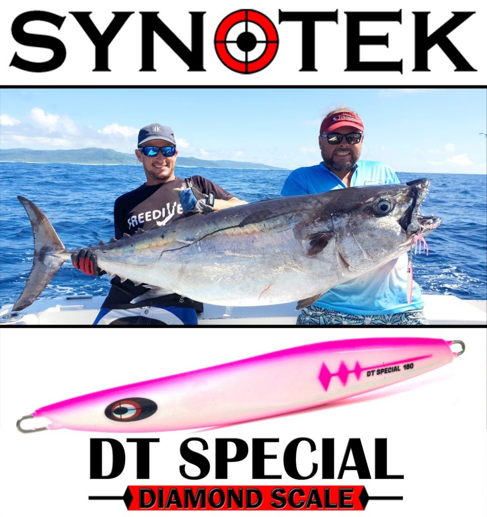 SYNOTEK has become one of the biggest high quality JIG product specialists in the world today and what we have seen from this company so far has been truly amazing. When you consider quality Vs price point we have found nothing else compares anywhere in the world. For the last 3 years we have been working with SYNOTEK to come up with a range of jigs with an amazing unique paint pattern design called DIAMOND SCALE. This unique paint feature which emulates a REALISTIC LATERAL LINE SCALE PATTERN, we have proven that it gains more interest from so many fish species compared to the standard paint designs seen everywhere these days on jigs. The SYNOTEK HIGH SPEED JIG range has been hand selected by the Elite Tackle team and the 5 different jig models available have been tried and tested already catching so many great fish species like the ultimate predator in the ocean the Dogtooth Tuna. The whole secret to these jigs is their amazing action that we have spent hours studying through underwater testing & videos to learn what gets the ultimate attention from aggressive predator fish. The DT SPECIAL JIG has been specifically designed to target fast moving pelagic species and can be worked medium pace with a rhythmic jigging action or extremely fast when speed jigging is required. The unique shape of this jig allows it to dart erratically often enticing reaction bites even when fish are being fussy. Ideal for targeting monster Dog Tooth Tuna, other Tuna species, King fish, Amberjack, Samson fish, Mackerel and many more.